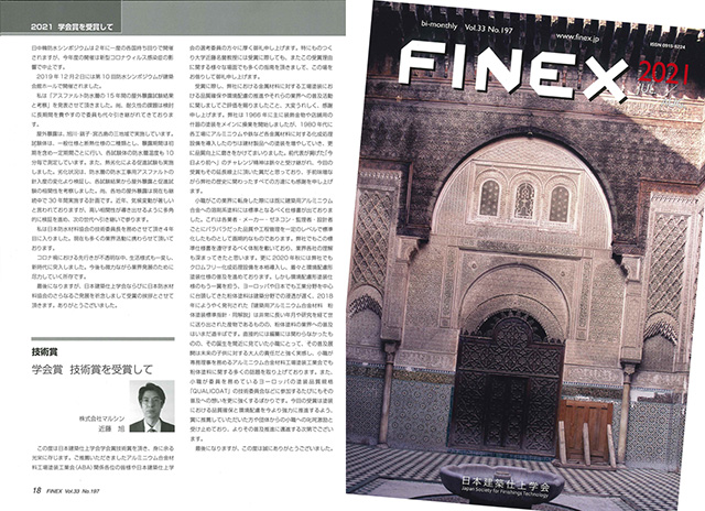 日本建築仕上学会 学会誌FINEX 2021 Vol.33にて近藤旭社長学会賞技術賞を受賞のコメントが掲載されました。