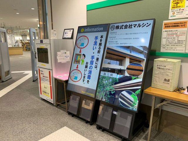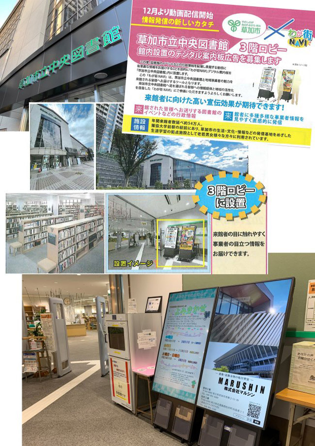 草加市立中央図書館3階ロビーにて、館内設置のデジタル案内板広告動画配信開始しました。